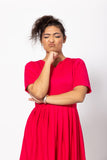 This bright pink dress will make you feel like a doll. You need not worry about light stains or wrinkles on the dress since it is made up of very soft scuba material. The fit and flare styled dress has got knife pleats which adds on to the flare. Wear this dress to any event or outing, it fits everywhere.