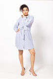 Blue Striped Belted Cotton Shirt Dress with Cuffed Sleeves
